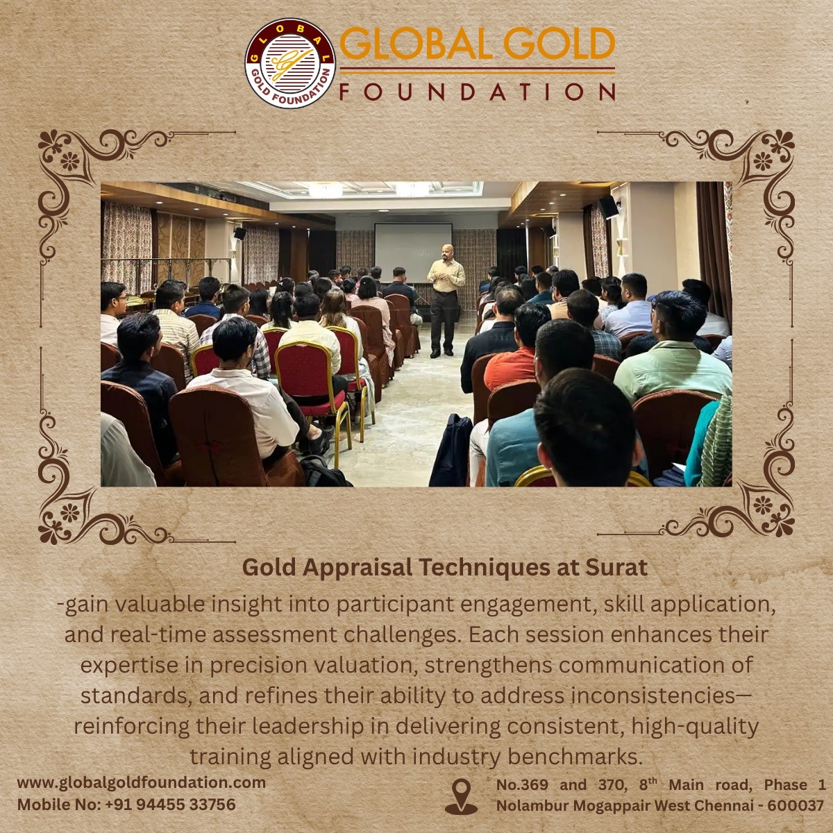 Gold Appraisal Techniques Training Successfully Conducted in Surat – Led by India’s Premier Gold Valuation Experts Global Gold Foundation, India’s foremost institution for professional gold appraisal education, successfully conducted its flagship Gold Appraisal Techniques Training in Surat. The intensive, hands-on program equipped participants from the jewellery, banking, and financial sectors with advanced, certification-based expertise in scientific gold valuation. With over 30 years of industry leadership and a legacy of 75, 000+ trained professionals, GGF continues to set the national benchmark for excellence in gold testing and valuation certification. The Surat session was led by GGF’s distinguished faculty—renowned for their depth of knowledge and practical teaching methodology—offering participants real-world experience with authentic gold samples and standardized techniques in purity assessment, hallmark verification, and jewellery evaluation. Professionals representing banks, NBFCs, jewellery retail chains, pawn institutions, and charitable organizations successfully earned the prestigious GGF Certified Gold Appraiser credential, a nationally recognized qualification known for its accuracy, credibility, and institutional relevance. GGF remains the trusted choice for professionals seeking: * Advanced gold appraisal training in Surat * Gold loan and valuation programs aligned with compliance and audit standards * Certified courses in jewellery testing and evaluation * BIS hallmark verification training from seasoned industry experts * Nationally recognized, mentor-led gold testing workshops designed for professional excellence With a mission to enhance technical precision and institutional trust in the gold sector, Global Gold Foundation continues to be India’s leading destination for professional gold appraisal and valuation training. As India’s most trusted name in gold appraisal education, Global Gold Foundation continues to set the benchmark for leading professional training in the precious metals industry. With continued demand for skilled gold appraisers, Global Gold Foundation reaffirms its position as the go-to destination for professional gold testing and certification programs across India. Phone: [94455 33756] Email: [sathish@globalgoldfoundation.com] Website: [www.globalgoldfoundation.com] 👉 To enroll in upcoming gold appraisal training programs or request customized corporate sessions, visit our website or contact us directly.