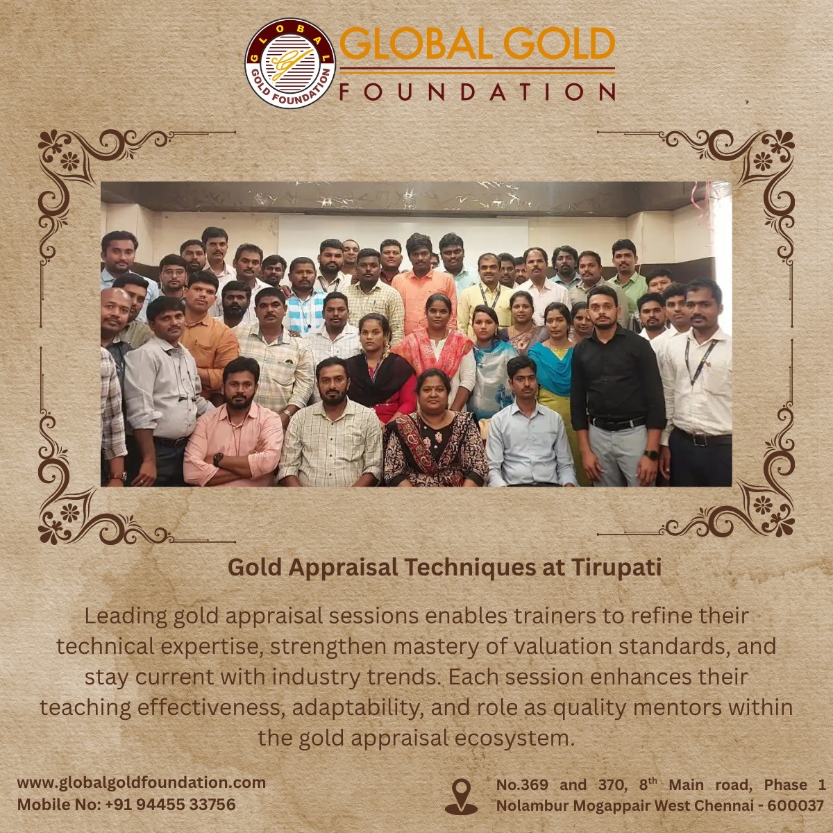 Gold Appraisal Techniques Training Successfully Conducted in Tirupati – Delivered by India’s Most Trusted Experts Global Gold Foundation (GGF), India’s best gold appraisal training institute, successfully conducted its flagship hands-on gold valuation program in Tirupati, empowering professionals with certified, practical expertise in gold purity testing, hallmark verification, and jewellery evaluation. Led by trusted mentors with over 30 years of industry experience, the Tirupati batch offered participants real-time exposure to authentic gold samples, ensuring practical skill development aligned with banking, retail, and institutional standards. Attendees included professionals from banks, NBFCs, jewellery outlets, pawnbrokers, and charitable trusts, all of whom earned the prestigious Certified Gold Appraiser credential—recognized nationwide for its credibility and operational relevance. ✅ Why Choose Global Gold Foundation? 30+ Years of Expertise in gold appraisal and training Recognized as the best gold testing institute in India 75, 000+ professionals trained across 3, 500+ programs Trusted mentors with real-world industry experience Fully practical, hands-on training with authentic gold samples Certification accepted by banks, NBFCs, and jewellery institutions Programs tailored for gold loan staff, appraisers, and retail professionals Strong presence across India with training hubs in Tirupati, Vijayawada, Hyderabad, Mysore, Chennai, Bangalore, and Trichy GGF continues to be the preferred choice for professionals seeking: The best gold appraisal training in South India Gold appraisal course in Vijayawada with practical certification Gold appraisal course in Hyderabad led by trusted mentors Gold appraisal course in Mysore with hands-on gold testing Gold appraisal course in Chennai aligned with industry standards Gold appraisal course in Bangalore for banking and jewellery professionals Gold appraisal course in Trichy with BIS hallmark verification training 📚 Training Topics Covered Fundamentals of gold purity testing Use of touchstone, acid testing methods BIS hallmark identification and fraud detection Jewellery valuation techniques for retail and loan purposes Differentiating between 22K, 18K, 14K, and 916 gold Handling stone-studded and antique jewellery Practical sessions with real gold samples Compliance and documentation for gold loan processing As India’s most trusted name in gold appraisal education, Global Gold Foundation continues to set the benchmark for leading professional training in the precious metals industry. With continued demand for skilled gold appraisers, Global Gold Foundation reaffirms its position as the go-to destination for professional gold testing and certification programs across India. Phone: [94455 33756] Email: [sathish@globalgoldfoundation.com] Website: [www.globalgoldfoundation.com] 👉 To enroll in upcoming gold appraisal training programs or request customized corporate sessions, visit our website or contact us directly.