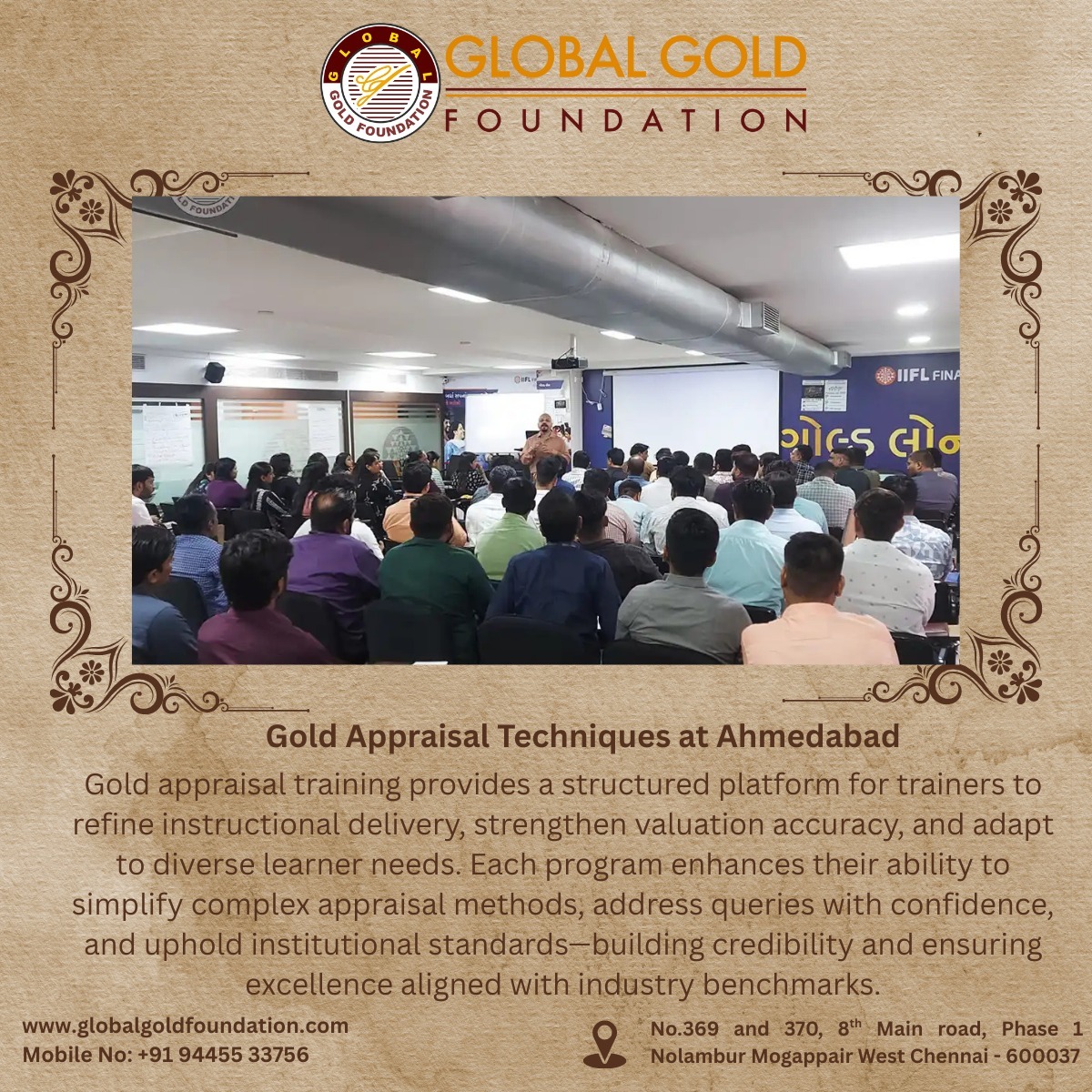 Gold Appraisal Training Conducted in Ahmedabad – MSME CFTI Certified Program by Global Gold Foundation India’s leading institute for gold appraisal techniques, successfully conducted its flagship Gold Appraisal Training Program in Ahmedabad, Gujarat. This program is designed for professionals seeking Certified Gold Appraisal Classes, Professional Gold Appraisal Training, and Top Gold Appraisal Programs that provide hands-on expertise in gold purity testing, hallmark verification, and jewellery evaluation. Participants of the Ahmedabad batch earned the prestigious MSME CFTI Certificate (Central Footwear Training Institute, Ministry of MSME), a credential widely recognized across India for its credibility, compliance, and operational relevance. 🌟 Practical & Industry-Oriented Training 30+ Years of Experience – trusted expertise in gold appraisal education. Expert Faculty – well-trained mentors with deep industry knowledge. Practical-Oriented Training – hands-on sessions with authentic gold samples for accurate skill-building. Industry-Level Modules – aligned with real-world practices in banking, jewellery retail, and gold loan institutions. 🔗 Flexible Training Formats Global Gold Foundation offers multiple training modes to suit diverse learners: Offline Training – classroom-based instruction with practical workshops. Hybrid Training (Online + 1-Day Offline) – blended format combining online theory with one-day practical exposure. This flexibility ensures that working professionals, students, and entrepreneurs can access industry-level gold appraisal training without compromising their schedules. 🌟 Why Choose Global Gold Foundation? Nationally Recognized Certification – MSME CFTI credential adds credibility to your career. 30+ Years of Legacy – proven track record in gold appraisal training. Practical Learning – real-world testing and evaluation methods. Industry-Oriented Curriculum – designed to meet the needs of banks, NBFCs, and jewellery businesses. Expert Faculty – trainers with decades of professional and teaching experience. Flexible Formats – offline and hybrid options tailored to learner needs. As India’s most trusted name in gold appraisal education, Global Gold Foundation continues to set the benchmark for leading professional training in the precious metals industry. With continued demand for skilled gold appraisers, Global Gold Foundation reaffirms its position as the go-to destination for professional gold testing and certification programs across India. Phone: [94455 33756] Email: [sathish@globalgoldfoundation.com] Website: [www.globalgoldfoundation.com] 👉 To enroll in upcoming gold appraisal training programs or request customized corporate sessions, visit our website or contact us directly.