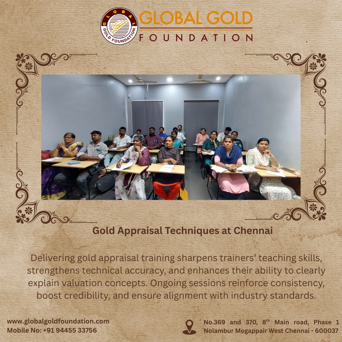 Gold Appraisal Training Conducted in Chennai – India’s Best Institute for Jewellery Valuation Global Gold Foundation, recognized as the best gold appraisal training institute in India, successfully conducted its flagship Gold Appraisal Training Program in Chennai, Tamil Nadu. This program is the best choice for professionals seeking Certified Gold Appraisal Classes, Professional Gold Appraisal Training, Top Gold Appraisal Programs, and Gold Appraiser Certification. Led by trusted mentors with over 30 years of expertise, the Chennai batch offered participants hands-on practice with authentic gold samples, ensuring industry-ready skills in gold purity testing, hallmark verification, and jewellery evaluation. Attendees included professionals from banks, NBFCs, pawnbrokers, jewellers, charitable trusts, and gold loan institutions, all of whom earned the prestigious GGF Certified Gold Appraiser credential—widely recognized across India for its credibility and operational relevance. 🌟 Importance & Career Scope For those planning a career in gold valuation, this program provides unmatched opportunities. Certified appraisers are in demand for: Gold loan appraisal training in banks, NBFCs, REPCO Bank, RBI, NABARD, and DCCBs Jewellery valuation certificate courses for retail and resale operations Independent gold assessment workshops for insurance, audits, and asset management Jewellery appraisal schools offering jewellery appraiser certification This training enhances career growth, credibility, and earning potential, making it the top choice for professionals seeking gold appraisal expertise. As India’s most trusted name in gold appraisal education, Global Gold Foundation continues to set the benchmark for leading professional training in the precious metals industry. With continued demand for skilled gold appraisers, Global Gold Foundation reaffirms its position as the go-to destination for professional gold testing and certification programs across India. Phone: [94455 33756] Email: [sathish@globalgoldfoundation.com] Website: [www.globalgoldfoundation.com] 👉 To enroll in upcoming gold appraisal training programs or request customized corporate sessions, visit our website or contact us directly.