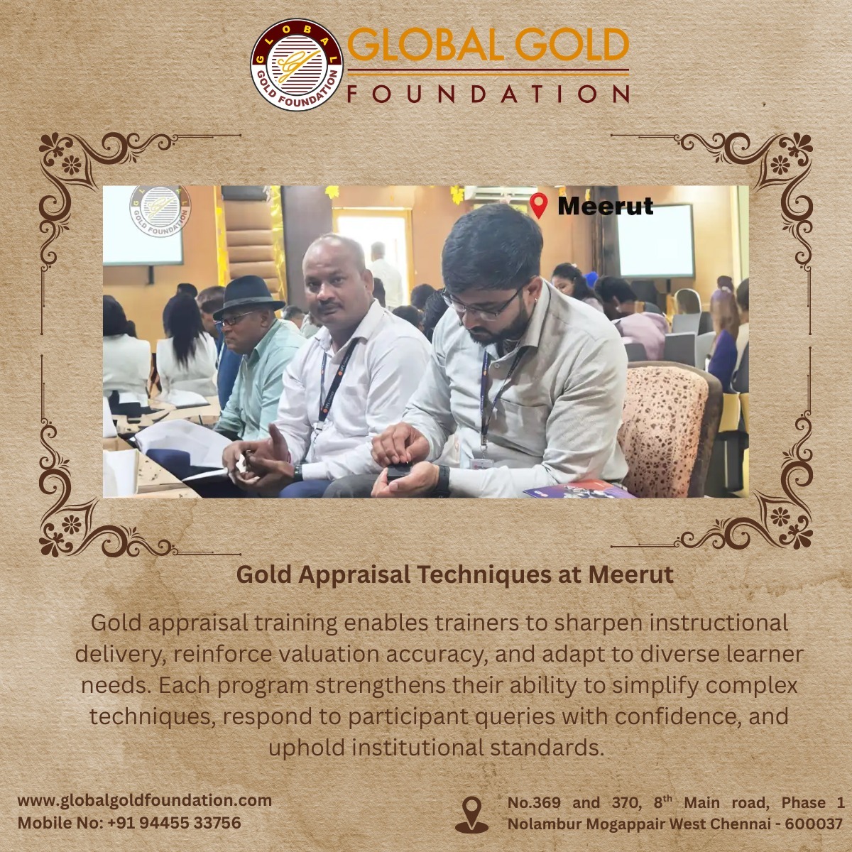 Gold Appraisal Training Conducted in Meerut Global Gold Foundation, recognized as India’s leading institute for gold appraisal techniques, successfully conducted its flagship Gold Appraisal Training Program in Meerut, Uttar Pradesh. This program is designed for professionals seeking Certified Gold Appraisal Classes, Professional Gold Appraisal Training, and Top Gold Appraisal Programs that provide practical expertise in gold purity testing, hallmark verification, and jewellery evaluation. Participants of the Meerut batch earned the prestigious MSME CFTI Certificate (Central Footwear Training Institute, Ministry of MSME), which is widely recognized across India for its credibility, compliance, and operational relevance. The training was led by trusted mentors with over 30 years of industry experience, offering hands-on practice with authentic gold samples. Attendees included professionals from banks, NBFCs, pawnbrokers, jewellers, charitable trusts, and gold loan institutions, all of whom benefitted from this nationally recognized certification. 🌟 Nationwide Presence – Locations Covered Global Gold Foundation conducts Gold Appraisal Training Programs not only in Meerut but also across India, including: Jaipur, Jodhpur, Kolhapur, Aurangabad, Chennai, Bhopal, Malda, Hisar, Bengaluru, Surat, Nagpur, Lucknow, Mysore, Rajkot, Thane, Vizag, Pune, Bathinda, Guwahati, and Kolkata. This ensures that professionals searching for gold appraisal training near me can access India’s top MSME-certified gold appraisal program in their region. 🌟 Career Scope and Benefits For those planning a career in gold valuation, this program is the best choice. Certified appraisers are in demand for: Gold loan appraisal training in banks, NBFCs, REPCO Bank, RBI, NABARD, and DCCBs Jewellery valuation certificate courses for retail and resale operations Independent gold assessment workshops for insurance, audits, and asset management Jewellery appraisal schools offering jewellery appraiser certification With the MSME CFTI Certificate, professionals gain nationally recognized credibility, making this the top gold appraisal course online and offline across India. As India’s most trusted name in gold appraisal education, Global Gold Foundation continues to set the benchmark for leading professional training in the precious metals industry. With continued demand for skilled gold appraisers, Global Gold Foundation reaffirms its position as the go-to destination for professional gold testing and certification programs across India. Phone: [94455 33756] Email: [sathish@globalgoldfoundation.com] Website: [www.globalgoldfoundation.com] 👉 To enroll in upcoming gold appraisal training programs or request customized corporate sessions, visit our website or contact us directly.