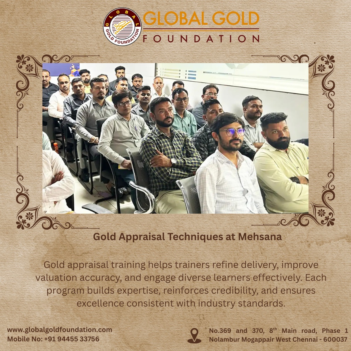 Gold Appraisal Training Conducted in Mehsana – MSME CFTI Certified Program by Global Gold Foundation India’s premier institute for gold appraisal education, successfully conducted its flagship Gold Appraisal Training Program in Mehsana, Gujarat. Known as the best gold appraisal training institute in India, GGF provides Certified Gold Appraisal Classes, Professional Gold Appraisal Training, and Advanced Gold Appraisal Programs designed to deliver hands-on expertise in gold purity testing, hallmark verification, and jewellery evaluation. Participants of the Mehsana batch received the prestigious MSME CFTI Certificate (Central Footwear Training Institute, Ministry of MSME), a nationally recognized credential that strengthens professional credibility and career opportunities across banking, jewellery, and gold loan sectors. 🌟 Training Excellence 30+ Years of Experience – a trusted legacy in gold appraisal education. Expert Faculty – industry professionals with decades of hands-on and teaching expertise. Practical-Oriented Training – real-world practice with authentic gold samples for accurate skill-building. Industry-Level Curriculum – aligned with operational standards in banks, NBFCs, and jewellery businesses. Flexible Formats – offline classroom sessions and hybrid (online + 1-day offline) workshops to suit diverse learners. 🌟 Why Choose Global Gold Foundation? Nationally Recognized Certification – MSME CFTI credential adds credibility to your professional profile. Proven Track Record – over 75, 000+ candidates trained successfully across India. Pan-India Presence – training programs conducted in major cities nationwide. Practical Learning Methods – focused on skill mastery through hands-on sessions. Industry-Oriented Curriculum – designed to meet the evolving needs of financial institutions and jewellery businesses. 🌍 Our National Footprints Global Gold Foundation conducts Gold Appraisal Training Programs not only in Mehsana but also across India, including: Ahmedabad, Jaipur, Jodhpur, Kolhapur, Aurangabad, Chennai, Bhopal, Malda, Hisar, Bengaluru, Surat, Nagpur, Lucknow, Mysore, Rajkot, Thane, Vizag, Pune, Bathinda, Guwahati, Moradabad, Patna, Bopal, Indore, Hyderabad, Anantapur, Jabalpur, Bhubaneswar, Hubli, Shimoga, Tirupati, Trichy, Madurai, Vadodara, and Kolkata. This ensures that professionals searching for gold appraisal training near me can access India’s top MSME-certified gold appraisal program in their region. As India’s most trusted name in gold appraisal education, Global Gold Foundation continues to set the benchmark for leading professional training in the precious metals industry. With continued demand for skilled gold appraisers, Global Gold Foundation reaffirms its position as the go-to destination for professional gold testing and certification programs across India. Phone: [94455 33756] Email: [sathish@globalgoldfoundation.com] Website: [www.globalgoldfoundation.com] 👉 To enroll in upcoming gold appraisal training programs or request customized corporate sessions, visit our website or contact us directly.