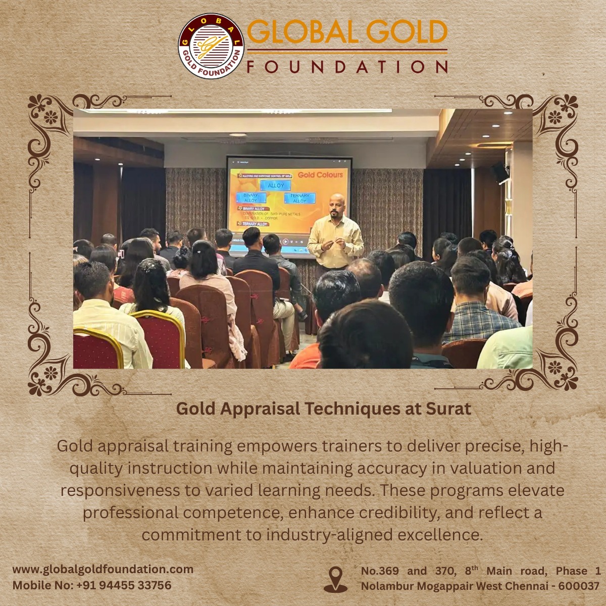 Gold Appraisal Training Program Successfully Conducted in Surat MSME–CFTI Certified Program by Global Gold Foundation a nationally recognized institute specializing in gold appraisal education, successfully conducted its flagship Gold Appraisal Training Program in Surat, Gujarat. Renowned for delivering industry-focused and certified training, GGF continues to set benchmarks in professional gold appraisal education across India. The program offered participants comprehensive exposure to gold purity assessment, hallmark verification, and jewellery valuation, equipping them with practical skills aligned with real-world industry requirements. Upon successful completion, participants were awarded the MSME–CFTI Certificate (Central Footwear Training Institute, Ministry of MSME)—a credential valued for its authenticity, regulatory relevance, and nationwide recognition. Practical, Industry-Aligned Training Excellence Over Three Decades of Expertise Backed by 30+ years of institutional experience in gold appraisal training. Experienced Faculty Training delivered by professionals with extensive industry and instructional backgrounds. Hands-On Learning Approach Practical sessions conducted using authentic gold samples to ensure precision and confidence in appraisal techniques. Industry-Relevant Curriculum Structured to meet operational requirements of banks, NBFCs, and jewellery enterprises. Flexible Learning Formats To accommodate diverse learner profiles, Global Gold Foundation offers: Offline Classroom Training In-person sessions combining theory with extensive practical workshops. Hybrid Training Model (Online + One-Day Offline Practical) A blended approach enabling participants to complete theoretical modules online, followed by an intensive hands-on practical session. These flexible formats make professional gold appraisal training accessible to working professionals, students, and entrepreneurs. Why Global Gold Foundation MSME–CFTI Certified Program ensuring national credibility Established Legacy of 30+ Years in gold appraisal education Practical, Skill-Based Training rooted in real-world application Industry-Oriented Curriculum designed for financial and jewellery sectors Expert Mentorship from seasoned professionals Flexible Learning Options to suit varied schedules Nationwide Training Presence Global Gold Foundation conducts Gold Appraisal Training Programs across major cities in India, including: Surat, Ahmedabad, Jaipur, Jodhpur, Kolhapur, Aurangabad, Chennai, Bhopal, Malda, Hisar, Bengaluru, Nagpur, Lucknow, Mysore, Rajkot, Thane, Visakhapatnam, Pune, Bathinda, Guwahati, Moradabad, Patna, Bopal, Indore, Hyderabad, Anantapur, Jabalpur, Bhubaneswar, Hubli, Shimoga, and Kolkata. This extensive national footprint ensures that aspiring professionals searching for gold appraisal training near them can access one of India’s most trusted MSME-certified gold appraisal programs. As India’s most trusted name in gold appraisal education, Global Gold Foundation continues to set the benchmark for leading professional training in the precious metals industry. With continued demand for skilled gold appraisers, Global Gold Foundation reaffirms its position as the go-to destination for professional gold testing and certification programs across India. Phone: [94455 33756] Email: [sathish@globalgoldfoundation.com] Website: [www.globalgoldfoundation.com] 👉 To enroll in upcoming gold appraisal training programs or request customized corporate sessions, visit our website or contact us directly.