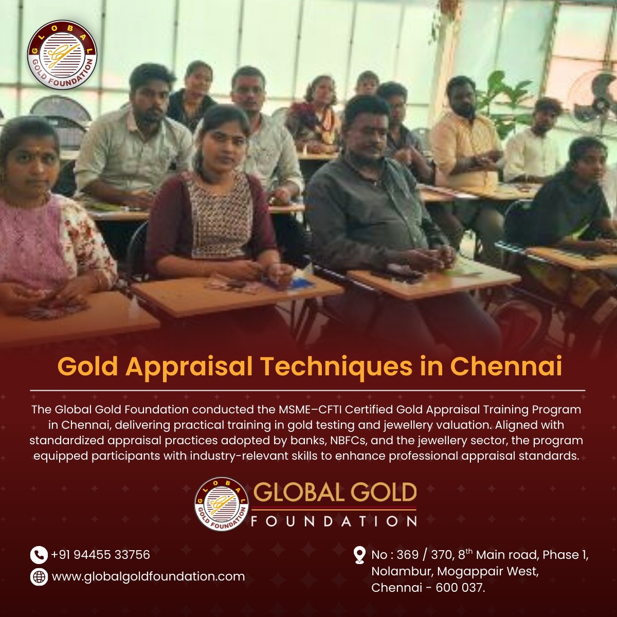 MSME–CFTI Certified Gold Appraisal Training Program Conducted Successfully in Chennai The Global Gold Foundation successfully conducted its MSME–CFTI Certified Gold Appraisal Training Program in Chennai, reinforcing its leadership in professional gold appraisal and jewellery valuation training in India. The program was designed to provide industry-ready skills in gold purity testing, jewellery evaluation, and appraisal practices aligned with standards followed by banks, NBFCs, gold loan companies, and jewellery businesses. Practical Gold Appraisal Training Aligned with Industry Standards The Chennai training program focused on hands-on, application-based learning, enabling participants to gain real-world exposure to professional gold appraisal techniques. Under expert supervision, trainees practiced standardized testing and valuation methods used across the financial and jewellery sectors. The comprehensive curriculum covered: Scientific gold purity testing methods Jewellery valuation techniques and best practices Risk assessment and quality verification procedures Appraisal norms accepted by banks and NBFCs With MSME–CFTI certification, participants received a nationally recognized credential, ensuring credibility, consistency, and compliance with professional appraisal standards. Enhancing Career Opportunities in Gold Appraisal The Certified Gold Appraisal Course in Chennai opened doors to employment opportunities across multiple sectors, including banks, NBFCs, gold loan companies, jewellery showrooms, and independent appraisal firms. The training also supports individuals aiming to start their own gold appraisal or jewellery valuation services. For youth and working professionals in Chennai, the program offered a structured pathway to build a stable and in-demand career in the gold and precious metals industry. Strengthening Regional Skill Development By conducting the program in Chennai, the Global Gold Foundation reaffirmed its commitment to regional skill development and vocational education. The initiative empowers local talent with industry-relevant skills and government-recognized certification, contributing to professional growth and economic empowerment. Pan-India Gold Appraisal Training Network The Global Gold Foundation conducts Gold Appraisal Training Programs across India, including cities such as Hyderabad, Bengaluru, Pune, Mumbai, Ahmedabad, Surat, Jaipur, Kolkata, Lucknow, Patna, Bhubaneswar, Guwahati, Visakhapatnam, Madurai, Mysore, and many more. This extensive network ensures easy access to certified gold testing and appraisal courses nationwide. Setting Benchmarks in Gold Appraisal Education Recognized as one of India’s most trusted institutions for gold appraisal training, the Global Gold Foundation continues to set benchmarks in professional gold testing and jewellery valuation education. With growing demand for certified appraisers, the Foundation remains the preferred destination for MSME–CFTI certified gold appraisal programs. Contact Details 📞 Phone: 94455 33756 📧 Email: sathish@globalgoldfoundation.com 🌐 Website: www.globalgoldfoundation.com 👉 To enroll in upcoming Gold Appraisal Training Programs or request customized corporate training sessions, visit the website or contact the team directly.