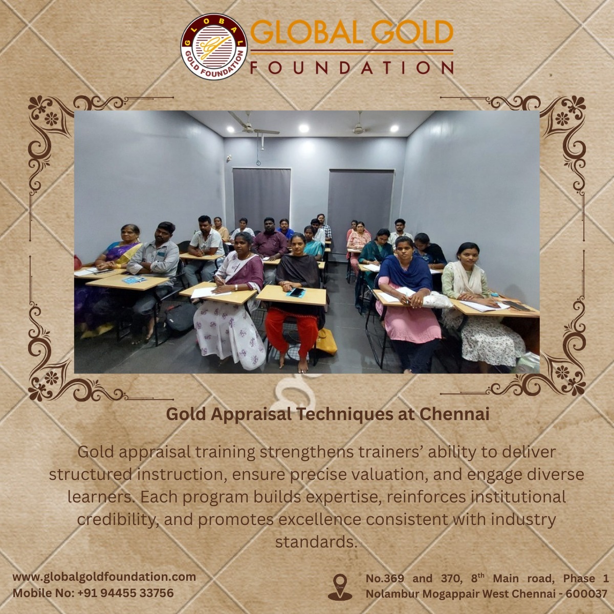 MSME CFTI Certified Gold Appraisal Training Program Successfully Conducted in Chennai by Global Gold Foundation India’s premier institute for Gold Appraisal Training, successfully conducted its MSME CFTI Certified Gold Appraisal Course in Chennai, Tamil Nadu. Known as one of the best gold appraisal training institutes in India, GGF continues to set national benchmarks in professional gold appraisal education through practical, industry-driven training programs. The Chennai batch completed an intensive Gold Appraisal Certification Program covering gold purity testing, hallmark verification, jewellery valuation, and gold loan appraisal techniques. Upon successful completion, participants were awarded the prestigious MSME CFTI Certificate (Central Footwear Training Institute – Ministry of MSME, Government of India), a nationally recognized credential valued across banks, NBFCs, gold loan companies, and jewellery businesses. Practical & Industry-Focused Gold Appraisal Training Global Gold Foundation’s Certified Gold Appraisal Training Program is designed to meet real-world industry requirements and ensure job-ready expertise. Key Training Highlights: 100% Practical Gold Appraisal Training with live gold samples and instruments Advanced Gold Purity Testing Techniques including hallmark verification Jewellery Valuation & Gold Loan Appraisal Methods Training by 30+ Years Experienced Faculty from banking and jewellery sectors Hybrid & Offline Gold Appraisal Courses for working professionals and entrepreneurs 75, 000+ Candidates Successfully Trained Across India Why Global Gold Foundation Is the Best Gold Appraisal Training Institute in India MSME CFTI Certified Gold Appraisal Course – nationally recognized credential Over 30 Years of Excellence in gold appraisal and valuation education Skill-Based Learning Approach focused on practical mastery Trusted by Banks, NBFCs & Jewellery Industry Pan-India Presence with regular training batches nationwide Career-Oriented Gold Appraisal Certification with strong placement relevance GGF’s programs are ideal for individuals seeking careers as Certified Gold Appraisers, Gold Loan Officers, Jewellery Valuation Experts, and Entrepreneurs in the Gold Business. Gold Appraisal Training Programs Available Across India In addition to Chennai, Global Gold Foundation conducts MSME-certified Gold Appraisal Training Programs across India, including: Ahmedabad, Surat, Vadodara, Rajkot, Jamnagar, Jaipur, Jodhpur, Kolhapur, Aurangabad, Bengaluru, Hyderabad, Nagpur, Pune, Lucknow, Mysore, Thane, Visakhapatnam, Bathinda, Guwahati, Moradabad, Patna, Bopal, Indore, Anantapur, Jabalpur, Bhubaneswar, Hubli, Shimoga, Tirupati, Trichy, Madurai, Malda, Hisar, and Kolkata. This wide reach ensures that professionals searching for “gold appraisal training near me”, “MSME gold appraisal course”, or “certified gold appraiser training in India” can easily access India’s most trusted gold appraisal education program. About Global Gold Foundation Global Gold Foundation is a nationally recognized leader in Gold Appraisal Training, Gold Valuation Certification, and Jewellery Appraisal Education. With a legacy spanning over three decades, GGF remains the preferred choice for professional gold appraisal training in India. As India’s most trusted name in gold appraisal education, Global Gold Foundation continues to set the benchmark for leading professional training in the precious metals industry. With continued demand for skilled gold appraisers, Global Gold Foundation reaffirms its position as the go-to destination for professional gold testing and certification programs across India. Phone: [94455 33756] Email: [sathish@globalgoldfoundation.com] Website: [www.globalgoldfoundation.com] 👉 To enroll in upcoming gold appraisal training programs or request customized corporate sessions, visit our website or contact us directly.