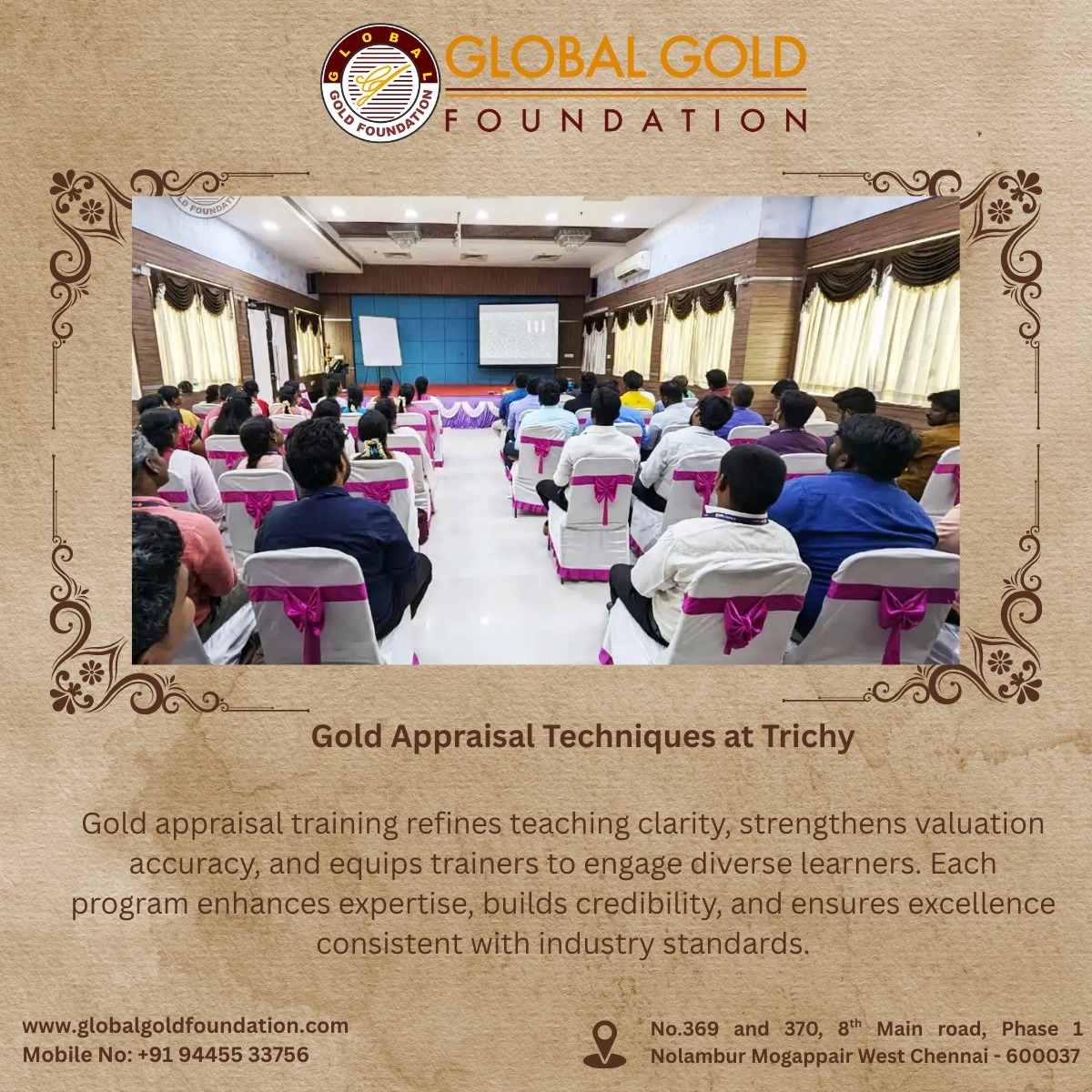 MSME CFTI Certified Gold Appraisal Training Program Successfully Conducted in Trichy by Global Gold Foundation India’s most trusted and recognized institute for gold appraisal training, successfully conducted its MSME CFTI Certified Gold Appraisal Training Program in Trichy, Tamil Nadu. Known as one of the best gold appraisal training institutes in India, GGF continues to set industry benchmarks through its professional gold appraisal courses and hands-on learning approach. The Trichy training program equipped participants with in-depth knowledge of gold purity testing, hallmark verification, jewellery valuation, and gold loan appraisal techniques, preparing them for careers in banks, NBFCs, financial institutions, and jewellery businesses. MSME CFTI Certification – A Nationally Recognized Credential Participants who completed the Trichy batch were awarded the prestigious MSME CFTI Certificate (Central Footwear Training Institute – Ministry of MSME, Government of India). This certification is widely accepted across India and adds strong credibility for professionals seeking roles in: Gold loan departments NBFCs and private banks Jewellery showrooms Financial and valuation services The MSME-certified gold appraisal course ensures compliance with industry standards and enhances employability nationwide. Practical, Industry-Focused Gold Appraisal Training With over 30+ years of experience in gold appraisal education, Global Gold Foundation emphasizes real-world learning and professional skill development. Key Training Highlights: Experienced Faculty – trainers with decades of industry and teaching expertise Practical-Oriented Classes – hands-on training using real gold samples Industry-Relevant Curriculum – aligned with banking, NBFC, and jewellery sector requirements Skill-Based Learning – gold testing methods, purity assessment, and valuation accuracy This approach makes GGF one of the top gold appraisal training institutes in India. Flexible Gold Appraisal Course Formats To support diverse learner needs, Global Gold Foundation offers flexible gold appraisal training options: Offline Gold Appraisal Training – classroom-based sessions with practical workshops Hybrid Gold Appraisal Course (Online + 1-Day Offline Practical) – ideal for working professionals and students These formats allow learners searching for gold appraisal training near me to gain professional certification without disrupting their schedules. Why Global Gold Foundation Is the Best Choice for Gold Appraisal Training MSME CFTI Certified Program – nationally recognized and industry-approved 30+ Years of Legacy – proven excellence in gold appraisal education Hands-On Practical Training – real-world gold testing techniques Industry-Oriented Syllabus – designed for banks, NBFCs, and jewellery businesses Expert Trainers – mentors with extensive professional experience Flexible Learning Options – offline and hybrid gold appraisal courses Nationwide Presence Across India Global Gold Foundation conducts certified gold appraisal training programs across major cities in India, including: Ahmedabad, Jaipur, Jodhpur, Kolhapur, Aurangabad, Chennai, Bhopal, Malda, Hisar, Bengaluru, Surat, Nagpur, Lucknow, Mysore, Rajkot, Thane, Vizag, Pune, Bathinda, Guwahati, Moradabad, Patna, Bopal, Indore, Hyderabad, Anantapur, Jabalpur, Bhubaneswar, Hubli, Shimoga, Tirupati, and Kolkata. This extensive national footprint ensures easy access to professional gold appraisal training in India, wherever learners are located. As India’s most trusted name in gold appraisal education, Global Gold Foundation continues to set the benchmark for leading professional training in the precious metals industry. With continued demand for skilled gold appraisers, Global Gold Foundation reaffirms its position as the go-to destination for professional gold testing and certification programs across India. Phone: [94455 33756] Email: [sathish@globalgoldfoundation.com] Website: [www.globalgoldfoundation.com] 👉 To enroll in upcoming gold appraisal training programs or request customized corporate sessions, visit our website or contact us directly.