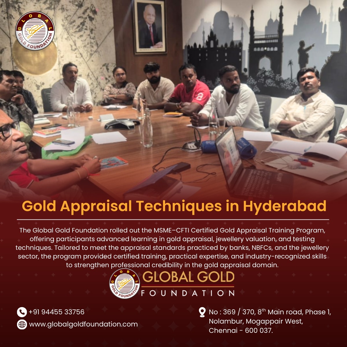 MSME–CFTI Certified Gold Appraisal Training Program Successfully Conducted in Hyderabad The Global Gold Foundation recently organized the MSME–CFTI Certified Gold Appraisal Training Program in Hyderabad, reinforcing its mission to advance professional expertise in gold appraisal training and jewellery valuation certification. This program was designed to provide participants with hands-on gold testing techniques and industry-recognized jewellery appraisal practices, aligned with appraisal standards followed by banks, NBFCs, and the jewellery industry. Practical, Industry-Focused Gold Appraisal Training The Hyderabad program emphasized experiential learning in gold purity testing and jewellery valuation, enabling participants to gain direct exposure to professional appraisal techniques under expert guidance. The structured curriculum ensured compliance with appraisal norms, preparing participants to deliver accurate and reliable valuation services. Key training modules included: Scientific methods of gold purity testing (touchstone, acid testing, hallmarking standards) Jewellery valuation techniques and best practices Risk assessment and fraud detection in gold appraisal Compliance with appraisal standards adopted by banks and NBFCs By adhering to MSME–CFTI certification standards, the program ensured credibility, uniformity, and national recognition, equipping participants with skills that are immediately applicable across financial institutions and jewellery businesses. Career Opportunities in Gold Appraisal The Global Gold Foundation gold appraisal course in Hyderabad continues to play a pivotal role in vocational training and certification in the precious metals industry. This certified program supports employment opportunities across banks, NBFCs, gold loan companies, jewellery showrooms, and independent appraisal firms. For youth and aspiring professionals in Hyderabad, the training offered a valuable pathway to career advancement in the growing gold appraisal and jewellery valuation industry. Commitment to Regional Skill Development The successful conduct of the program in Hyderabad reflects the Foundation’s dedication to extending skill-based gold appraisal education beyond metropolitan hubs. By empowering regional talent with nationally recognized certification, the initiative contributes to both professional excellence and economic empowerment. Pan-India Reach Global Gold Foundation organizes gold appraisal training programs across India, including major cities such as Bengaluru, Chennai, Pune, Mumbai, Ahmedabad, Surat, Jaipur, Kolkata, Lucknow, Patna, Bhubaneswar, Guwahati, Visakhapatnam, Madurai, Mysore, and many more. This extensive presence ensures convenient access to MSME-certified gold appraisal courses for professionals nationwide. Setting Standards in Gold Appraisal Education As India’s most trusted name in gold appraisal training and certification, the Global Gold Foundation continues to set benchmarks for professional excellence in the precious metals industry. With demand for skilled appraisers steadily rising, the Foundation reaffirms its role as the preferred destination for certified gold testing and jewellery valuation programs. 📞 Phone: [94455 33756] 📧 Email: [sathish@globalgoldfoundation.com] 🌐 Website: [www.globalgoldfoundation.com] 👉 To enroll in upcoming gold appraisal training programs in Hyderabad or request customized corporate sessions, please visit our website or contact us directly.