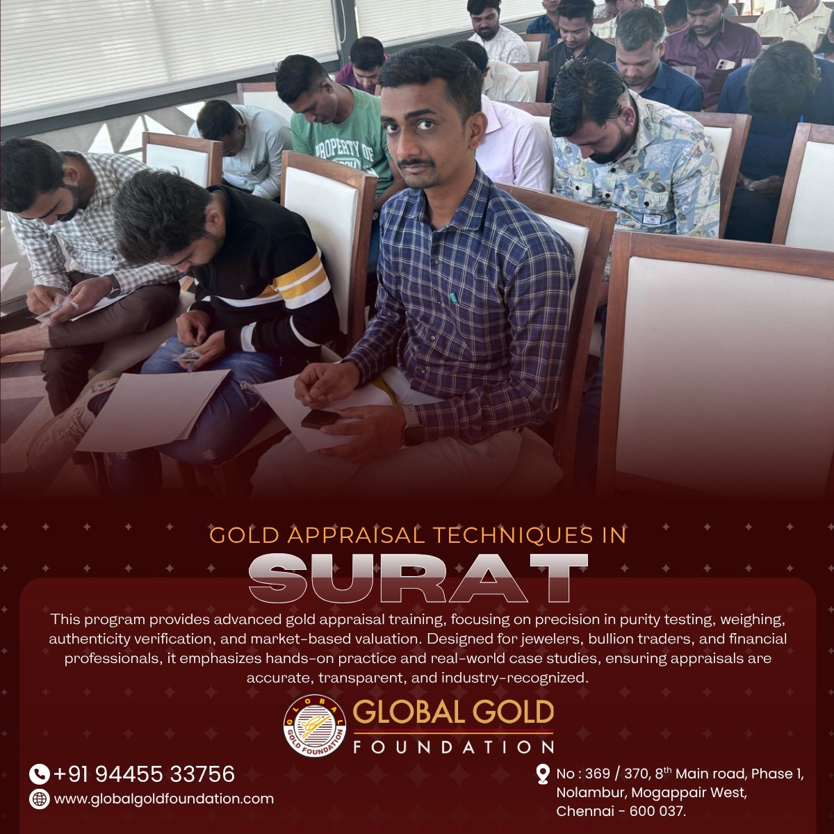 MSME–CFTI Certified Gold Appraisal Training Program Successfully Conducted in Surat Global Gold Foundation successfully conducted a professional Gold Appraisal Training Program in Surat, Gujarat, delivering industry-focused certification in gold testing, jewellery valuation, and gold loan appraisal. This program was designed to meet the growing demand for certified gold appraisers in Western India, particularly in Surat’s thriving gold finance, jewellery retail, diamond jewellery, and bullion trading sectors. Global Gold Foundation – Excellence in Gold Appraisal Training Global Gold Foundation is a trusted institution specializing in professional gold appraisal education. Our programs combine scientific gold purity testing, BIS hallmark verification, and banking-compliant valuation practices to ensure participants gain industry-ready skills. With a strong reputation across India, GGF empowers professionals to serve in banks, NBFCs, jewellery businesses, and bullion trading firms with confidence and credibility. Why Choose Gold Appraisal Training in Surat with GGF? Surat is globally recognized as a hub for jewellery and diamond trade, making it a prime location for gold appraisal training. With increasing reliance on gold loans and certified valuations, the demand for skilled professionals is rising. By training with Global Gold Foundation in Surat, participants gain: Banking-compliant gold loan appraisal expertise Practical knowledge of gold testing and jewellery valuation Skills in fraud detection and authenticity verification Exposure to real-time appraisal scenarios MSME-recognized certification trusted nationwide Key Modules in Gold Appraiser Certification Course The Gold Appraisal Course in Surat conducted by Global Gold Foundation covered: Scientific gold purity testing techniques BIS hallmark verification and quality assessment Market-based bullion pricing and valuation methods Jewellery valuation practices for financial institutions Gold loan appraisal procedures and documentation Fraud detection and risk analysis in gold transactions Professional appraisal report preparation Career Opportunities with GGF Certification Graduates of the MSME Gold Appraiser Certification in Surat can explore careers in: Banks and financial institutions NBFCs and gold loan companies Jewellery retail and manufacturing businesses Independent gold appraisal consultancy Bullion trading and precious metals industry Program Highlights Hands-on training with modern gold testing equipment Real-world case studies and practical sessions Training aligned with banking and NBFC requirements Fraud detection and valuation accuracy exercises MSME-recognized certification by Global Gold Foundation Who Can Join? This program is ideal for: Aspiring gold appraisers Jewellery professionals and business owners Banking and NBFC staff Entrepreneurs in the gold and bullion trade Graduates seeking career-oriented training Expanding Gold Appraisal Training Across India Global Gold Foundation continues to deliver gold appraisal and jewellery valuation training programs across major cities in India, strengthening professional standards nationwide. Training programs are conducted in Chennai, Hyderabad, Rajkot, Nagpur, Ahmedabad, Bhubaneswar, Indore, Guwahati, Bhopal, Kolkata, Bangalore, Mysuru, Tirupati, Vizag, Trichy, Vadodara, Madurai, Salem, Thane, Pune, Aurangabad, Jodhpur, Kolhapur, Malda, Hisar, and Surat. Contact Global Gold Foundation 📞 Phone: 94455 33756 📧 Email: sathish@globalgoldfoundation.com 🌐 Website: www.globalgoldfoundation.com 👉 Enroll today with Global Gold Foundation for professional gold appraisal training in Surat and gain industry-recognized certification in gold testing, jewellery valuation, and gold loan appraisal.