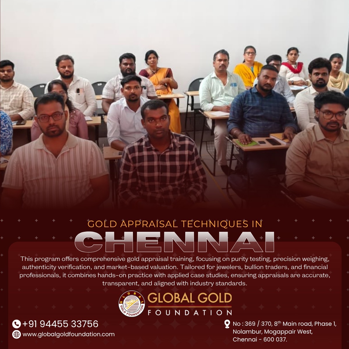 MSME–CFTI Certified Gold Appraisal Training Program Successfully Conducted in Chennai. Global Gold Foundation successfully conducted a professional Gold Appraisal Training Program in Chennai, Tamil Nadu, delivering industry-recognized certification in gold testing, jewellery valuation, and gold loan appraisal. This program was designed to meet the rising demand for certified gold appraisers in South India, particularly in Chennai’s expanding gold finance, jewellery retail, and bullion trading sectors. Global Gold Foundation – Excellence in Gold Appraisal Training Global Gold Foundation is India’s leading institution specializing in gold appraisal education. Our training programs combine scientific gold purity testing, hallmark verification, and banking-compliant valuation practices to ensure participants gain practical, industry-ready skills. With a strong reputation nationwide, GGF empowers professionals to serve confidently in banks, NBFCs, jewellery businesses, and bullion trading firms. Why Choose Gold Appraisal Training in Chennai with GGF? Chennai is one of India’s most prominent hubs for gold trade, jewellery manufacturing, and gold-backed finance. By enrolling with Global Gold Foundation in Chennai, participants gain: Industry-focused gold appraisal expertise Practical knowledge of gold loan valuation procedures Skills in fraud detection and authenticity verification Exposure to real-time appraisal scenarios Certification trusted across professional sectors Comprehensive Training Modules by Global Gold Foundation The Gold Appraisal Course in Chennai covered: Scientific gold purity testing techniques Hallmark verification and quality assessment Market-based bullion pricing and valuation methods Jewellery valuation practices for financial institutions Gold loan appraisal procedures and documentation Fraud detection and risk analysis in gold transactions Professional appraisal report preparation Career Opportunities with GGF Certification Participants trained by Global Gold Foundation in Chennai can pursue careers in: Banks and financial institutions NBFCs and gold loan companies Jewellery retail and manufacturing businesses Independent appraisal consultancy services Bullion trading and precious metals industry Program Highlights Hands-on training with modern gold testing equipment Real-world case studies and practical sessions Training aligned with banking and NBFC requirements Fraud detection and valuation accuracy exercises Certification recognized across India’s gold ecosystem Who Can Join? This program is ideal for: Aspiring gold appraisers Jewellery professionals and business owners Banking and NBFC staff Entrepreneurs in the gold and bullion trade Graduates seeking career-oriented training Expanding Gold Appraisal Training Across India Global Gold Foundation continues to deliver gold appraisal and jewellery valuation training programs across major cities in India, strengthening professional standards nationwide. Training programs are conducted in Chennai, Hyderabad, Rajkot, Nagpur, Ahmedabad, Bhubaneswar, Indore, Guwahati, Bhopal, Kolkata, Bangalore, Surat, Mysuru, Tirupati, Vizag, Trichy, Vadodara, Madurai, Salem, Thane, Pune, Aurangabad, Jodhpur, Kolhapur, Malda, Hisar, and more. Contact Global Gold Foundation 📞 Phone: 94455 33756 📧 Email: sathish@globalgoldfoundation.com 🌐 Website: www.globalgoldfoundation.com 👉 Enroll today with Global Gold Foundation for professional gold appraisal training in Chennai and gain industry-recognized certification in gold testing, jewellery valuation, and gold loan appraisal.